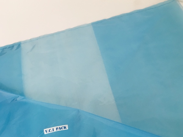 VCI氣相防銹膜(防銹袋)是將高分子聚乙烯樹脂(LDPE)與功能VCI樹脂配比混合,采用現(xiàn)代薄膜共擠技術生產(chǎn)的新一代復合防銹薄膜。具有良好的氣化防銹性能、阻隔防潮、使用方便、透明直觀等特點;當用塑料袋包裹金屬產(chǎn)品時,氣相緩蝕劑在封閉空間內氣化并凝聚在所有金屬表面上形成氣相保護層,從而防止金屬產(chǎn)品銹蝕。符合GB-T19532-2004防銹性能要求。